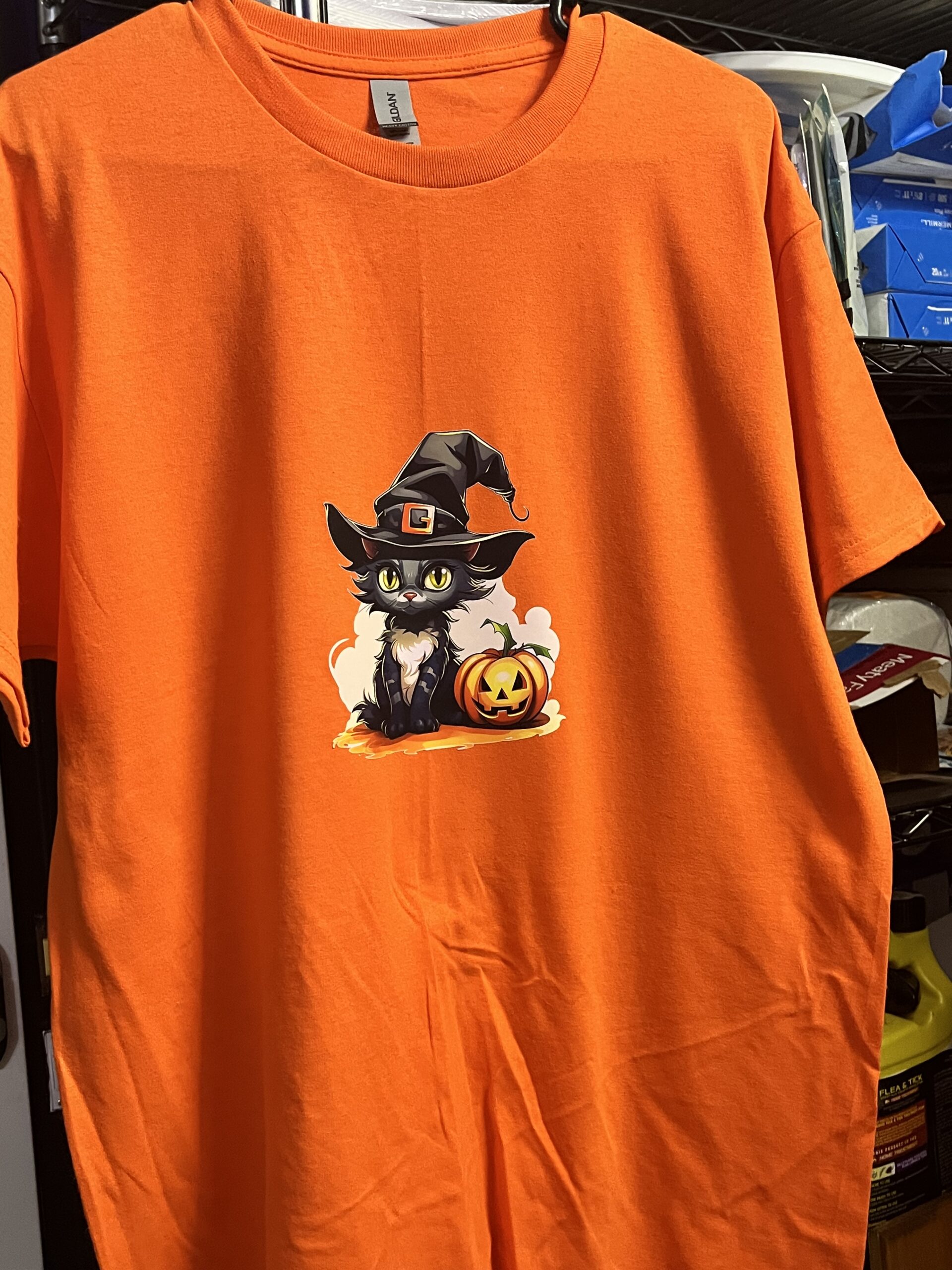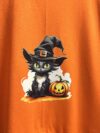 100% cotton tshirt with super cute tuxedo cat. Cat is ready to trick or treat!